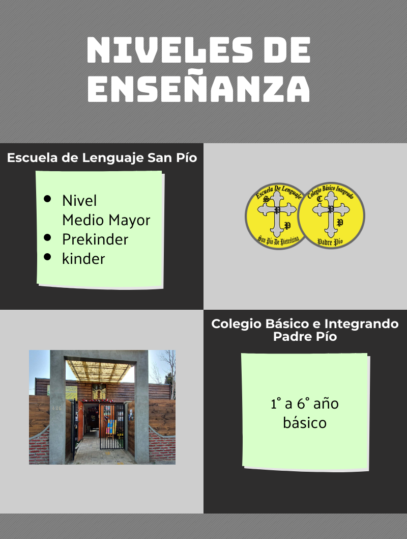 El Colegio Básico Integrado Padre Pio, es fundado el año 2015 bajo la necesidad de dar continuidad educativa a niños y niñas pertenecientes a la Escuela de lenguaje San Pio de Pietrelcina, cuyo nacimiento fue en el año 2003 e inspirado en el legado valórico del sacerdote Católico Padre Pio. Sus gestores, miembros activos de la iglesia católica emprenden un proyecto educativo en donde los educandos, independiente de su condición social, cultural, religiosa y su propias capacidades cognitiva, habilidades artísticas y deportivas, reciban sin distinción alguna una educación de calidad sustentada en el reconocimiento de la diversidad dentro de un clima de respeto, generosidad, tolerancia y condescendencia frente al sufrimiento de otros, centrado en valores y virtudes del ser humano, desarrollando un tipo de educación única, innovadora, personalizada e integradora, a partir de la inspiración del legado de San Pío.